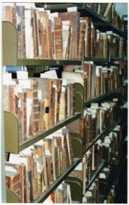 Removing each book from the shelf, assessed its condition, surface cleaning, making protective wrappers etc, returning to cleaned shelves