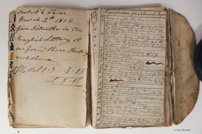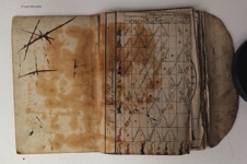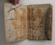 Before Conservation - Extensive mould damage, missing leather corners and spine, very fragile paper