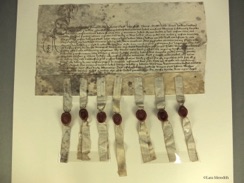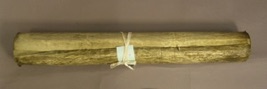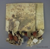 A tightly rolled manuscript on vellum on two leaves with wax seal broken and detached