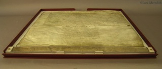 Cleaned, flattened, repaired and mounted in a bespoke box that would allow each leaf of the document to be viewed without removing it from the protective box